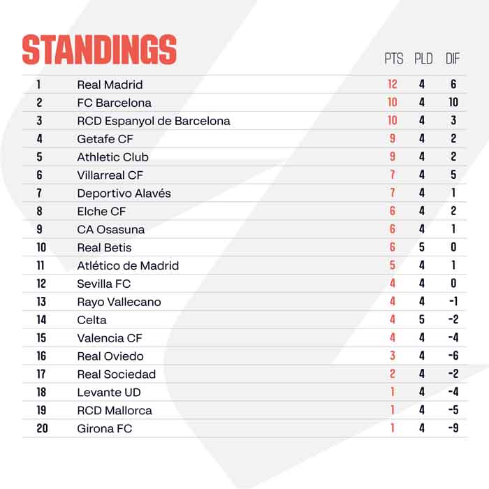 League leaders Real Madrid are in action next, taking on RCD Espanyol at the Bernabéu. The Catalan side have had an excellent start to the season, winning three and drawing one of their four fixtures to date. Manolo González has already defeated Real Madrid once as RCD Espanyol coach, so this is certainly a tricky fixture for Los Blancos.