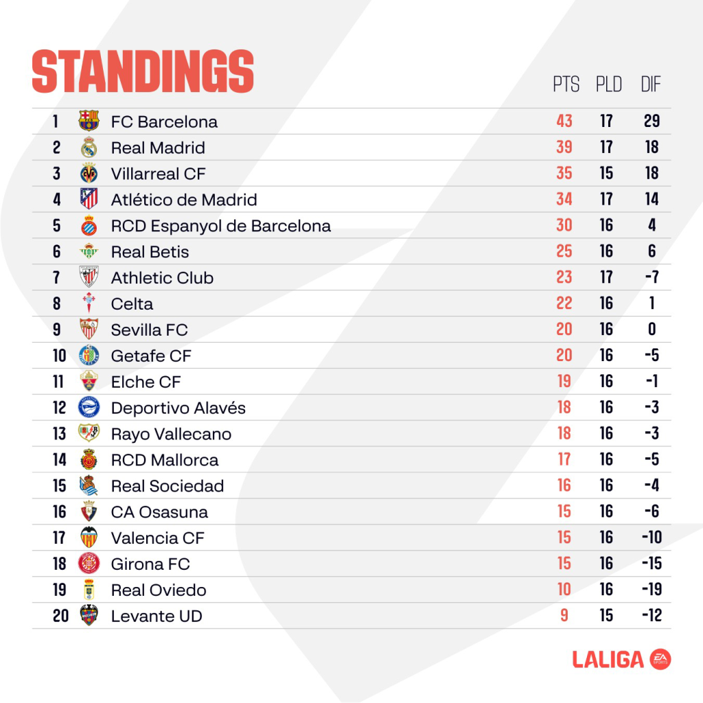 The final LALIGA EA SPORTS game of 2025 is the Monday night battle between Athletic Club and RCD Espanyol. The Catalan outfit are in excellent form, with four league victories in a row heading into this match at San Mamés. It won’t be easy against former coach Ernesto Valverde’s charges, but if Los Pericos can make it five victories in a row to round off the year then they truly can dream of European qualification as they enter 2026.