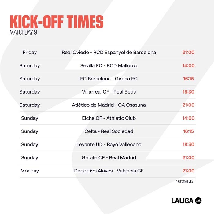 The first of the Matchday 9 fixtures takes place on Friday night in Asturias, where Real Oviedo’s new coach Luis Carrión will lead his side against RCD Espanyol. Carrión is no stranger to the Estadio Carlos Tartiere, where he was in charge in 2023/24, and he’ll hope to begin this second stint with a victory.