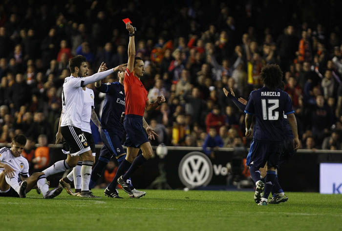 The second half continued to ebb and flow and, soon after Cristiano Ronaldo was denied a penalty claim, visiting midfielder Mateo Kovačić was red-carded for a high tackle on Valencia CF’s João Cancelo with 22 minutes remaining. Gareth Bale seemed to have won the three points for Real Madrid’s 10 men when he headed in Toni Kroos’ late freekick but Gary Neville’s Valencia CF were level within a minute when Rodrigo Moreno nodded down for Paco Alcácer to coolly head home.