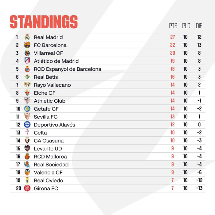 There is one more game to conclude Matchday 11, the Monday night duel between Real Oviedo and CA Osasuna. It hasn’t been a great start for Luis Carrión since he returned to Los Azules, having suffered Copa del Rey elimination in midweek and having failed to win any of his first three games, so he’ll hope for a victory at the Estadio Carlos Tartiere this Monday night.